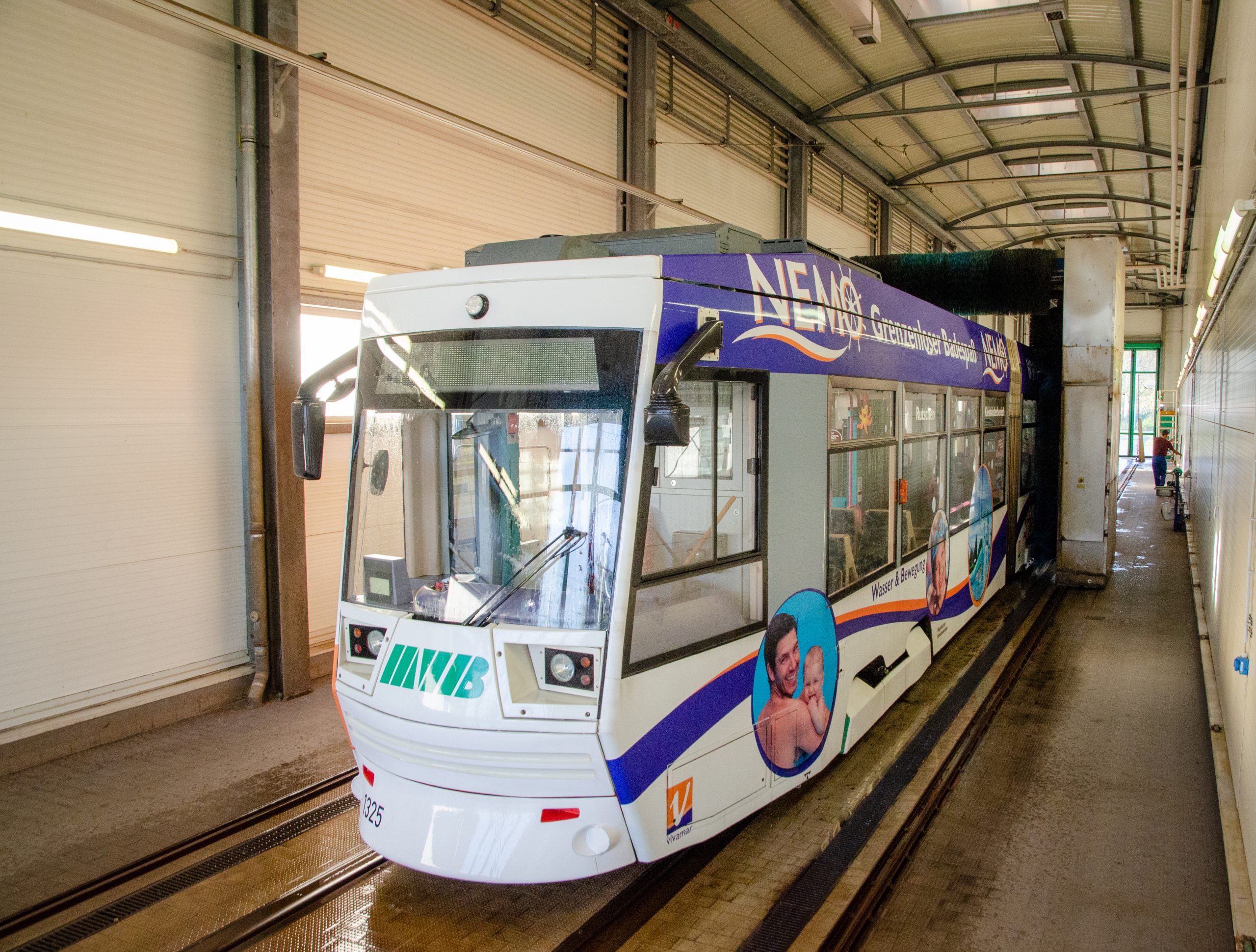 scherzt Daniel Strauchmann. Von Außen werden die Busse übrigens etwas häufiger gewaschen, als die Straßenbahnen. Der Grund liegt auf der Hand: So ein Bus fährt eben ausschließlich auf der Straße, wohingegen die Tram immer mal wieder auf ihrem eigenen Gleis, fernab der Straße, unterwegs ist. Zudem wirbeln die Reifen eines Busses mehr Wasser und Staub auf, als es die schmalen Stahlräder der Bahn tun.